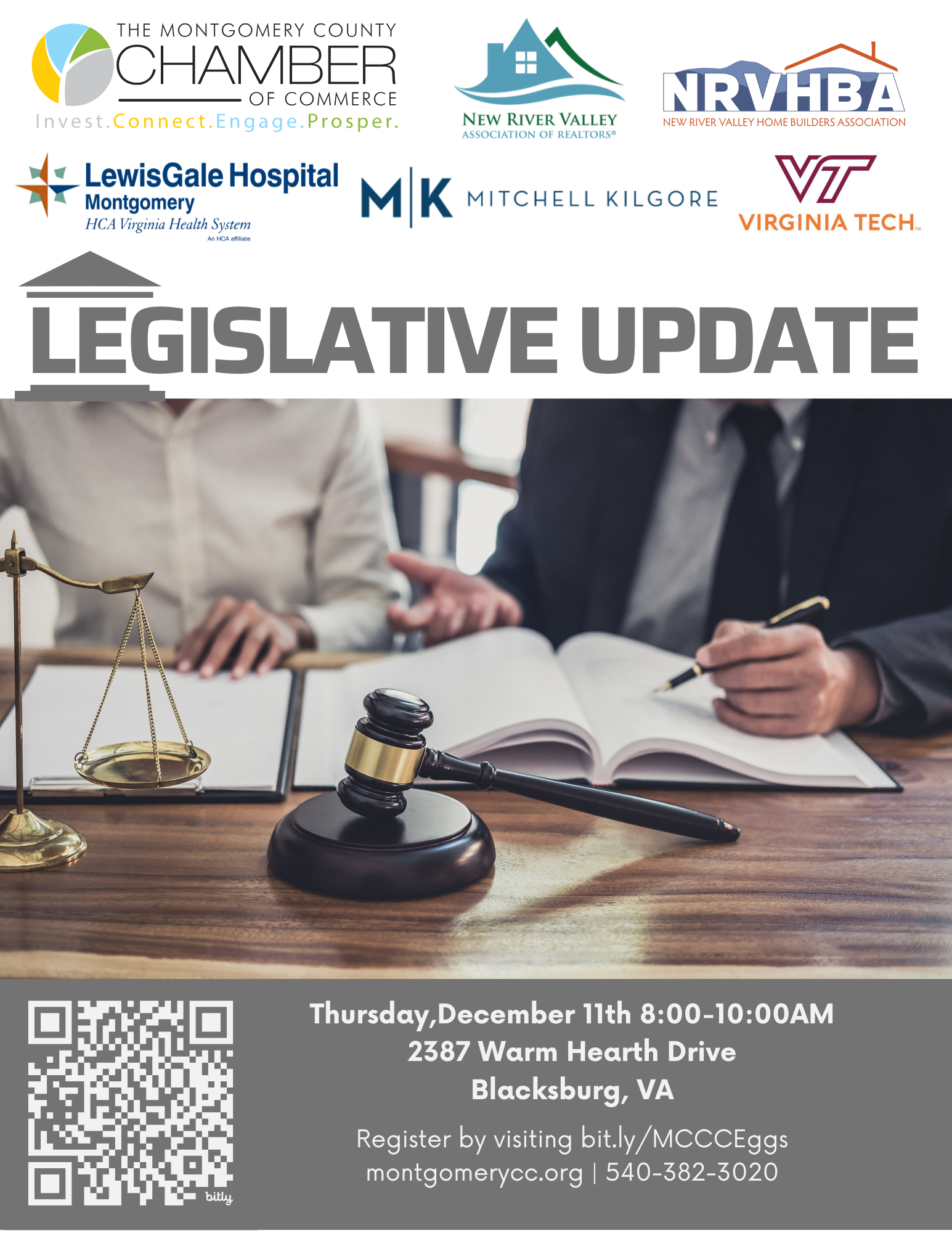 Please join the Montgomery County Chamber of Commerce, New River Valley Home Builders Association and the New River Valley Association of Realtors, for the annual Pre-Session Legislative Meeting & Breakfast.